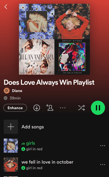 One of the other songs on there, also by girl in red, is “we fell in love in October,” because Shorty and Kristy’s relationship began to develop throughout September and October. I also had to include “I Kissed a Girl,” by Katy Perry, because it’s a personal favorite that I used to play when I realized I also liked girls.